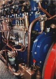 The red cap of the magneto at top left with the brass inlet manifold across the top of the engine.Not an engine for those of us who open the engine covers once a season, oil circulation is checked, not with a gauge, but by opening a dainty brass tap on the port side of the engine. The water pump oil level and the governor oil level have to be maintained too, although the latter uses diesel oil spilled from the injectors when the engine is started and is running on petrol. The governor overflows into a bottle. Yes, Kelvin even supplied a bracket specially designed to take a Teacher's whiskey bottle! Marketing, research and customer care was active in 1934!
