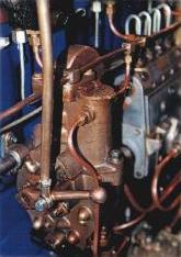 The starboard side of the engine. Water pump at the front, fuel pump in the centre with the governor behind it.Mike has a 55ft Josher replica, Pangur Bán (White Cat in Gaelic), built at Roger Fullers' Five Towns Boatbuilding at Stone, and was enthusiastic about my photographing his Kelvin J4. Meeting Mike was rather like digging the garden and striking oil. His Internet web site is recognised as the "unofficial" Kelvin web site and having rebuilt his engine from a pile of bits he knows what's what.