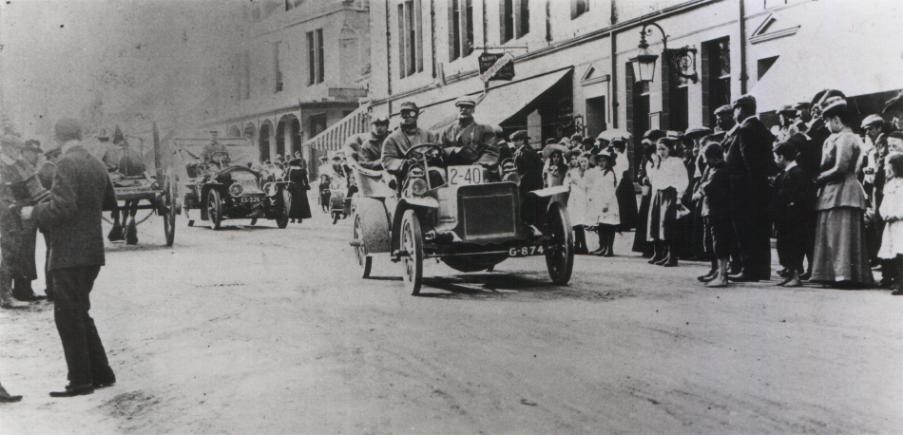 The Kelvin Car (G 874) arriving in Pitlochry on the 15th June 1906 whilst competing in the 670 mile Scottish reliability trials of the 13th, 14th, 15 & 16th of June 1906. Driving is Mr. Walter Bergius, the designer and builder of the car, with a scrutineer of The Royal Scottish Automobile Club sitting beside him. The Bergius Car and Engine Company, 169 Finnieston Street, Glasgow. |