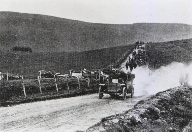 The Kelvin Car (G 874) climbing Cairnwell Hill (the Devil's Elbow) on the second day of the 670 mile Scottish reliability trials on the 14th of June 1906 Driving is Mr. Walter Bergius, the designer and builder of the car. The Bergius Car and Engine Company, 169 Finnieston Street, Glasgow. |