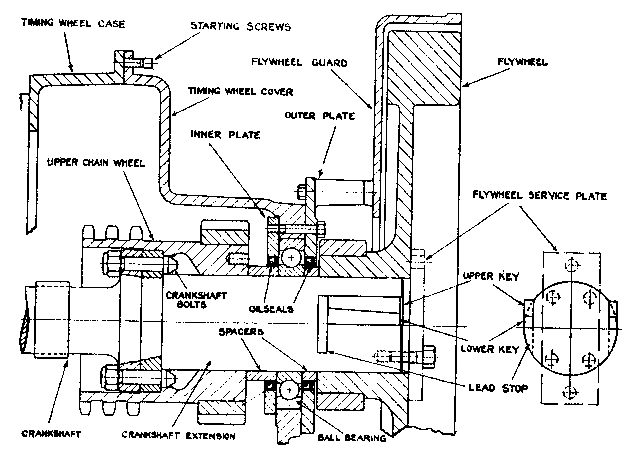 84. OIL ESCAPES BEHIND FLYWHEEL. (K Engine)-- If water is permitted to reach the crankshaft at the back of the fly wheel, rust will occur, and the white metal oil retaining ring will be destroyed. As this cannot easily be rectified, it is important to allow no water to reach the flywheel (99).85. FRONT OIL RETAINING RING. (K Engine)--Fitted around the crankshaft and immediately behind the flywheel there is a white metal ring to prevent escape of oil. To remove it first prise off the spring and then remove the upper half of the iron plate. The plate must be rejointed with cement (120).