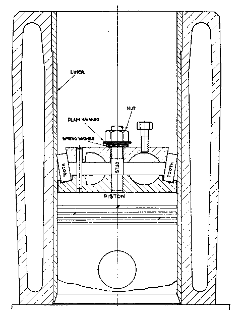 77. PISTON.--The piston and connecting rod are removable through the inspection door on the starboard side. It is desirable to have some assistance to turn the flywheel, in order to bring the crank into the various positions necessary for this operation. If any of the piston rings are stuck fast, they must be broken out and renewed.78. PISTON RINGS.--If the slackness sideways exceeds .020", the grooves should be enlarged for oversize (.030") rings. If the pistons cannot be sent to us for this service, it must be done locally. A small piece of a new ring will be found useful as a gauge. The groove should be of sufficient width to allow it to enter flush, along with a feeler .004" to provide the necessary clearance.