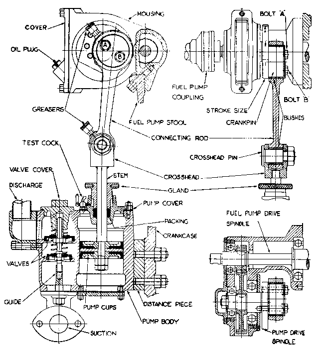 CONNECTING ROD.--Has renewable bushes grease lubricated. The greasers should be kept full and given an occasional turn to ensure adequate lubrication.PUMP GLAND.--If water leaks up the pump stem, tighten the gland using finger pin provided in tool box. To repack the stuffing box, remove crosshead pin and swing connecting rod clear, pull stem up to maximum position, unscrew the gland and add a turn of packing. The packing should be completely renewed at time of engine overhaul, or at least once a year.