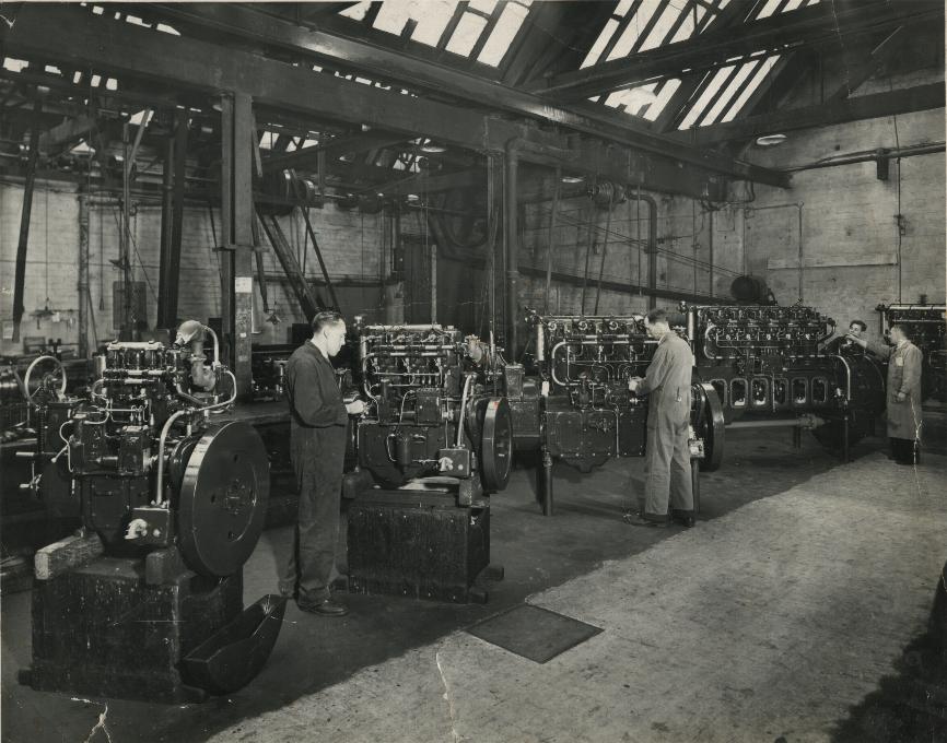 The engines from left to right (all diesels) are:- Models J2 (Cold start with larger flywheel), J3 (Petrol start), K4, KR6 and LR6. The line Shafting in the background is a small machine shop for the making up of propeller shafts, sterntubes etc. for the individual engine orders. This was left after the main machine shop was moved to Stafford Street in 1921.