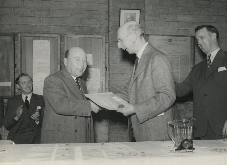 David W.Willocks (Chairman) presenting a long service gold watch to Alec. Cree (Works Director) at the Golden Jubilee Celebrations of The Bergius Co. Ltd, June 1954 watched by A.D.MacKay (M.D.)(standing) and George Bergius (son of the founder, seated). 'AC' joined the Company in 1906; his father owned a coach building business and built the bodies for the 'Kelvin' cars and later all the spray hoods for 'Kelvin' launches. He served his apprenticeship with the Company and went on to become Works Manager and finally Works Director. He designed all the jigs and tools necessary for 'batch production' and many specialized machine tools. Walter Bergius considered 'AC' to be the best jig and tool designer in the country.